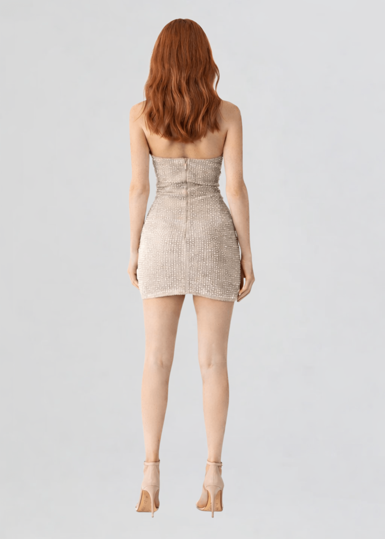 The Crystal Mini Dress in Nude is the perfect dress for a form-fitting and stylish look. Made from a stretch crystal fabric, this mini dress is both comfortable and fashionable. The back zipper ensures a secure fit, while the fabric's slight stretch allows for easy movement.