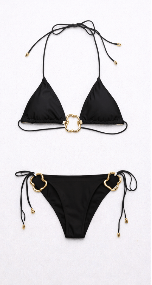 The epitome of stylish swimwear is the black high-shine triangle bikini top with gold accent. It is made of glossy fabric and features delicate gold trim elements and adjustable triangle cups, giving a classic form a hint of luxury. For a unified, opulent look, accessorize with gold jewelry and tie-side bikini bottoms.