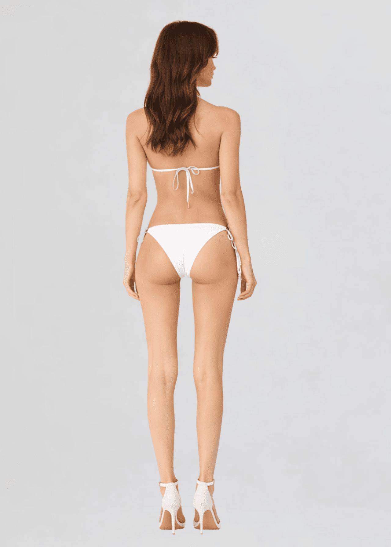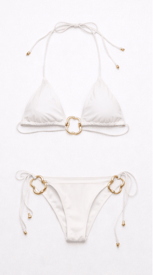 The epitome of stylish swimwear is the white high-shine triangle bikini top with gold accent. It is made of glossy fabric and features delicate gold trim elements and adjustable triangle cups, giving a classic form a hint of luxury. For a unified, opulent look, accessorize with gold jewelry and tie-side bikini bottoms.