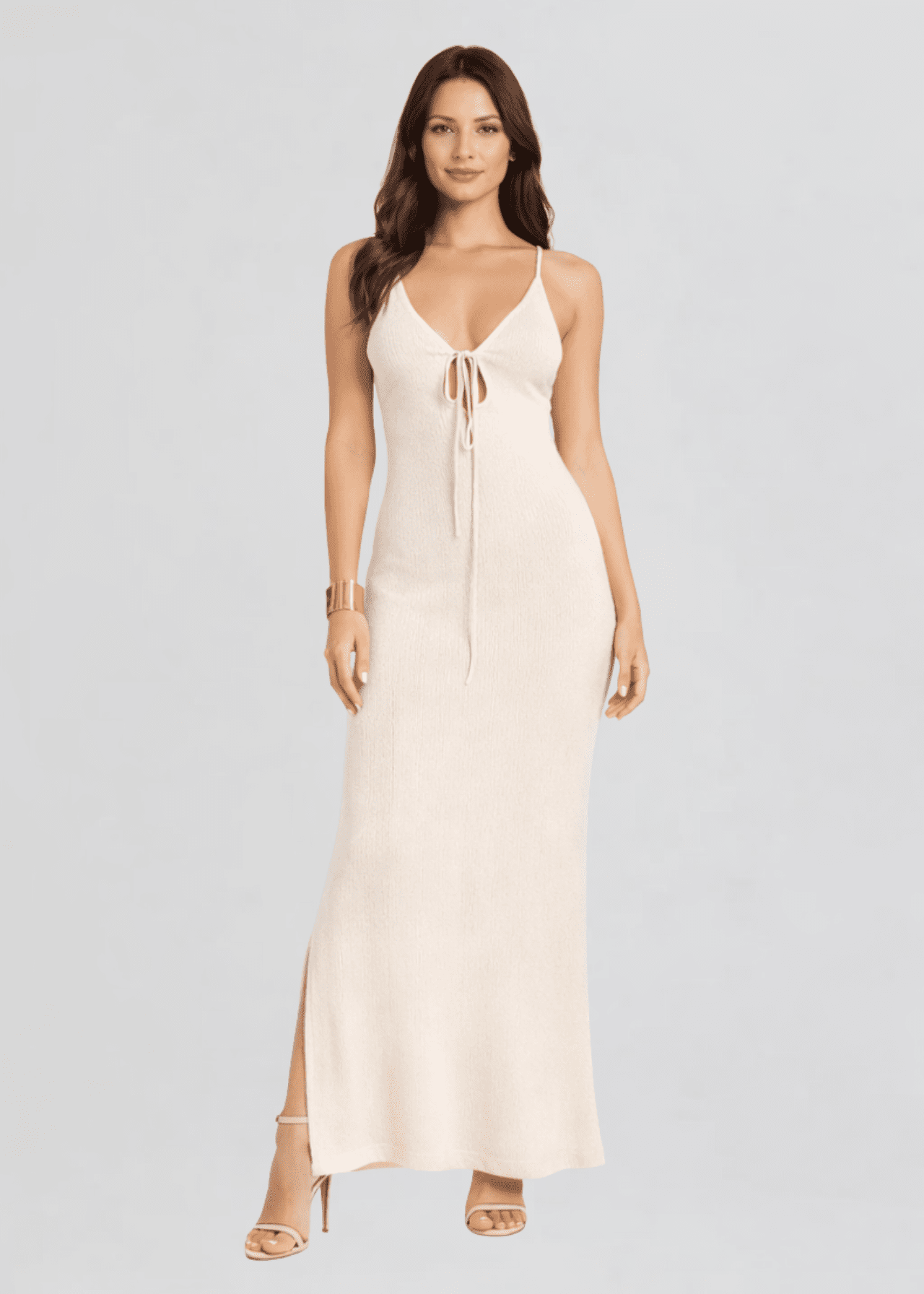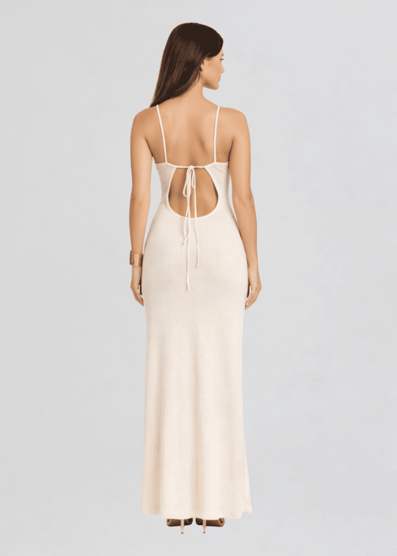 Deep V Knit Halter Dress featuring an open back. Our Goldie Dress makes for the perfect vacation outfit.