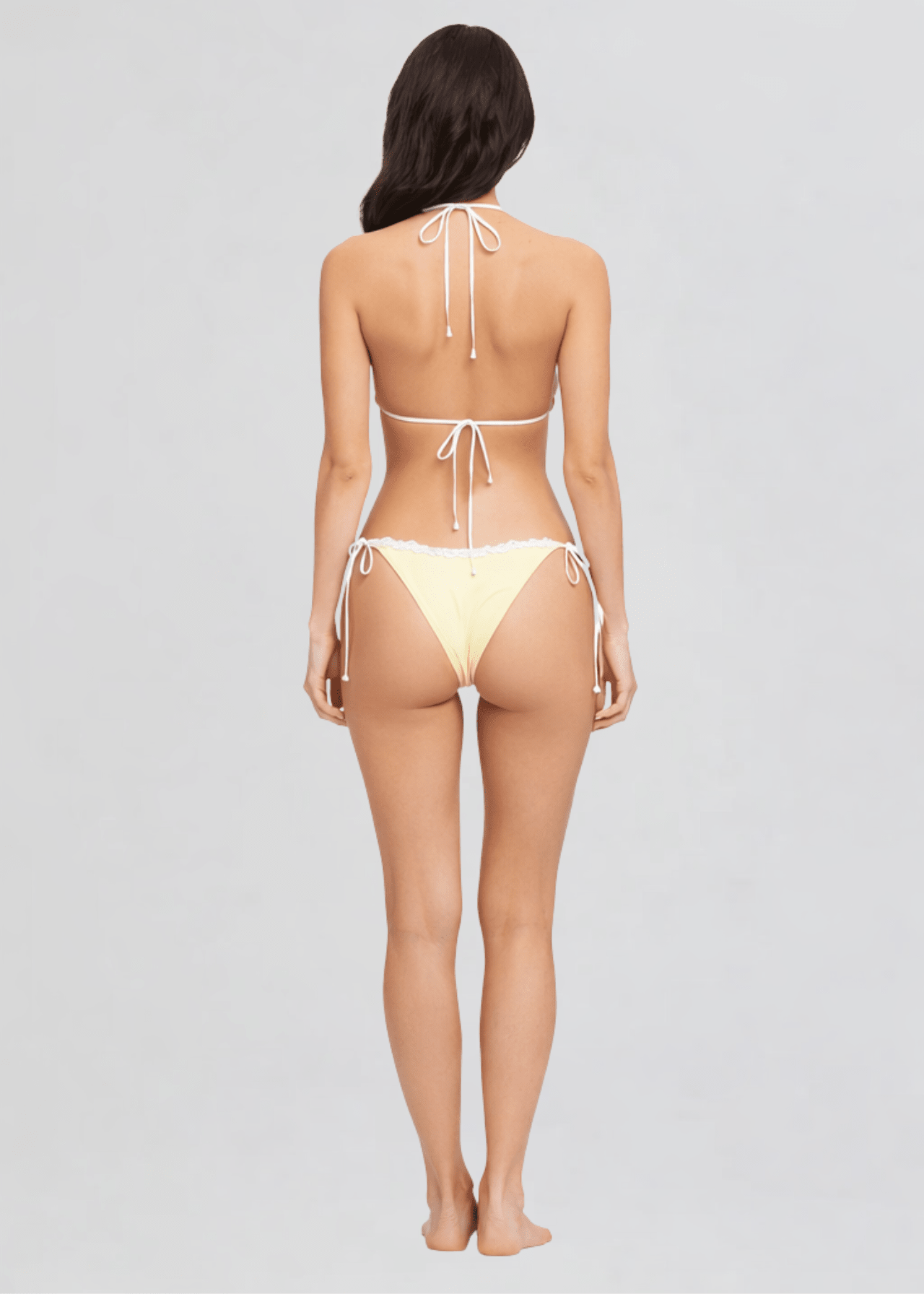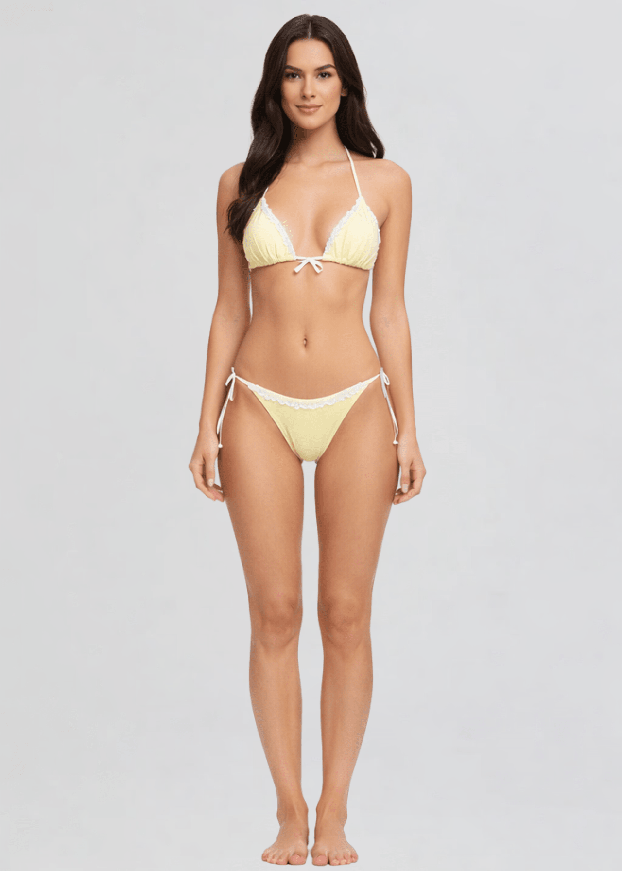 Sweet, feminine, and effortlessly flattering — the Luna Bikini is designed to make a statement in the sun. Crafted in a soft pastel yellow hue, this two-piece set features delicate white lace trim and dainty bow accents for a romantic, playful finish.