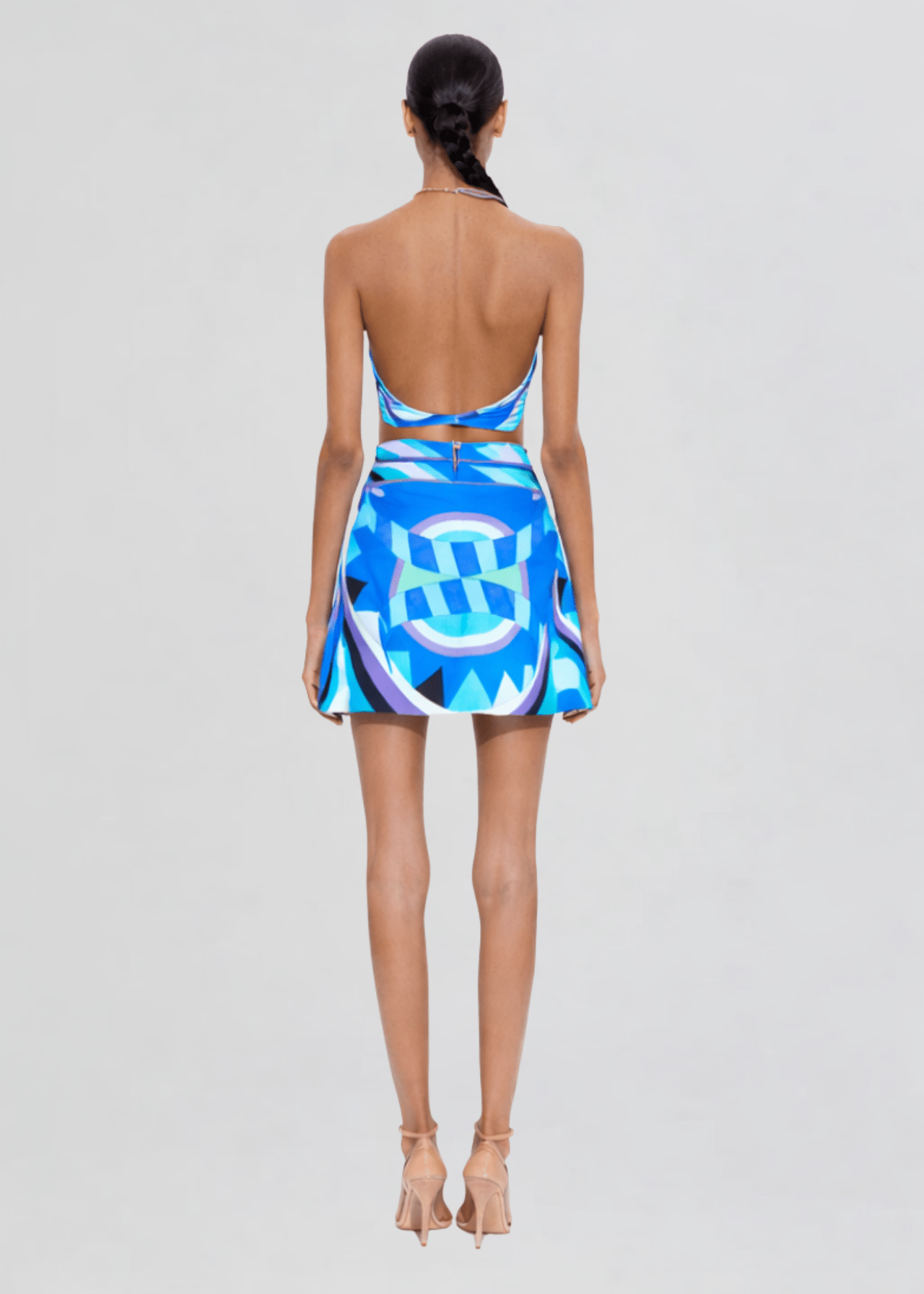Dive into vibrant style with the Lisboa 2-piece set. This bold and playful ensemble features a geometric print in electric shades of aqua, lavender, indigo, and teal. The one piece ties at the back and neck with sleek black strings, elevated by a luxe gold chain detail that clips elegantly behind the neck. Paired with a coordinating a matching mini skirt cover-up, this set is perfect for turning heads poolside or beachside.