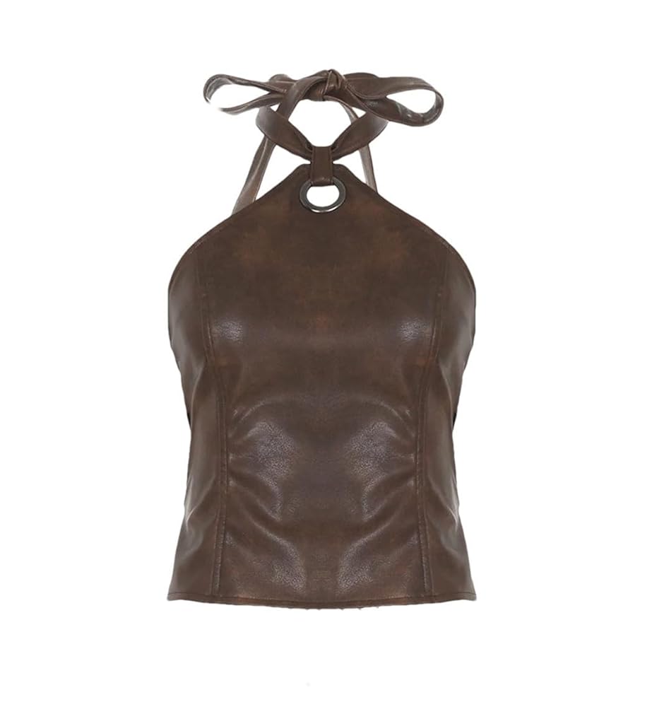 Halter faux leather top featuring a hoop ring detail, adjustable halter straps, and an open back with lace-up tie fastenings.