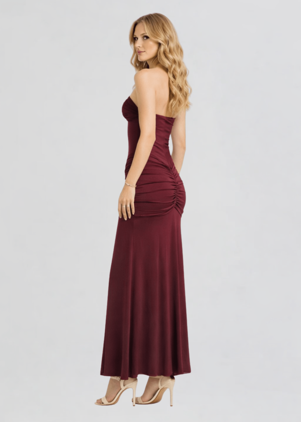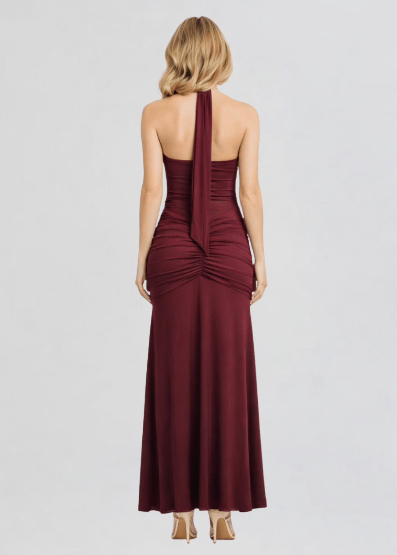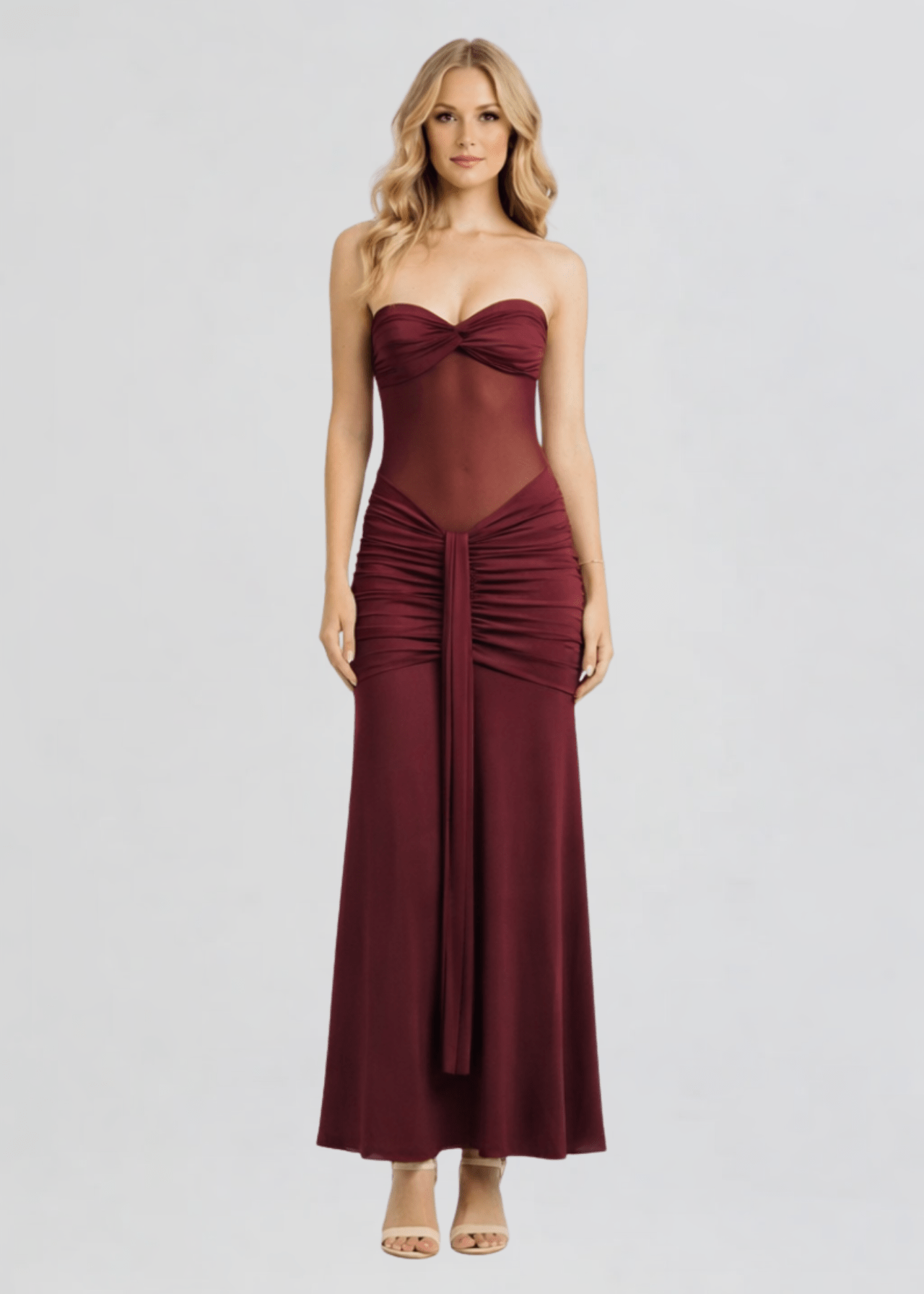 The Mermaid Maxi Dress features a stretch slinky jersey and sheer mesh bodice with a sweetheart neckline and halter ties. Its fit-and-flare silhouette is enhanced by a ruched hip panel and a delicate front tie detail. Fully lined bust and skirt ensure comfort without the need for a zipper.