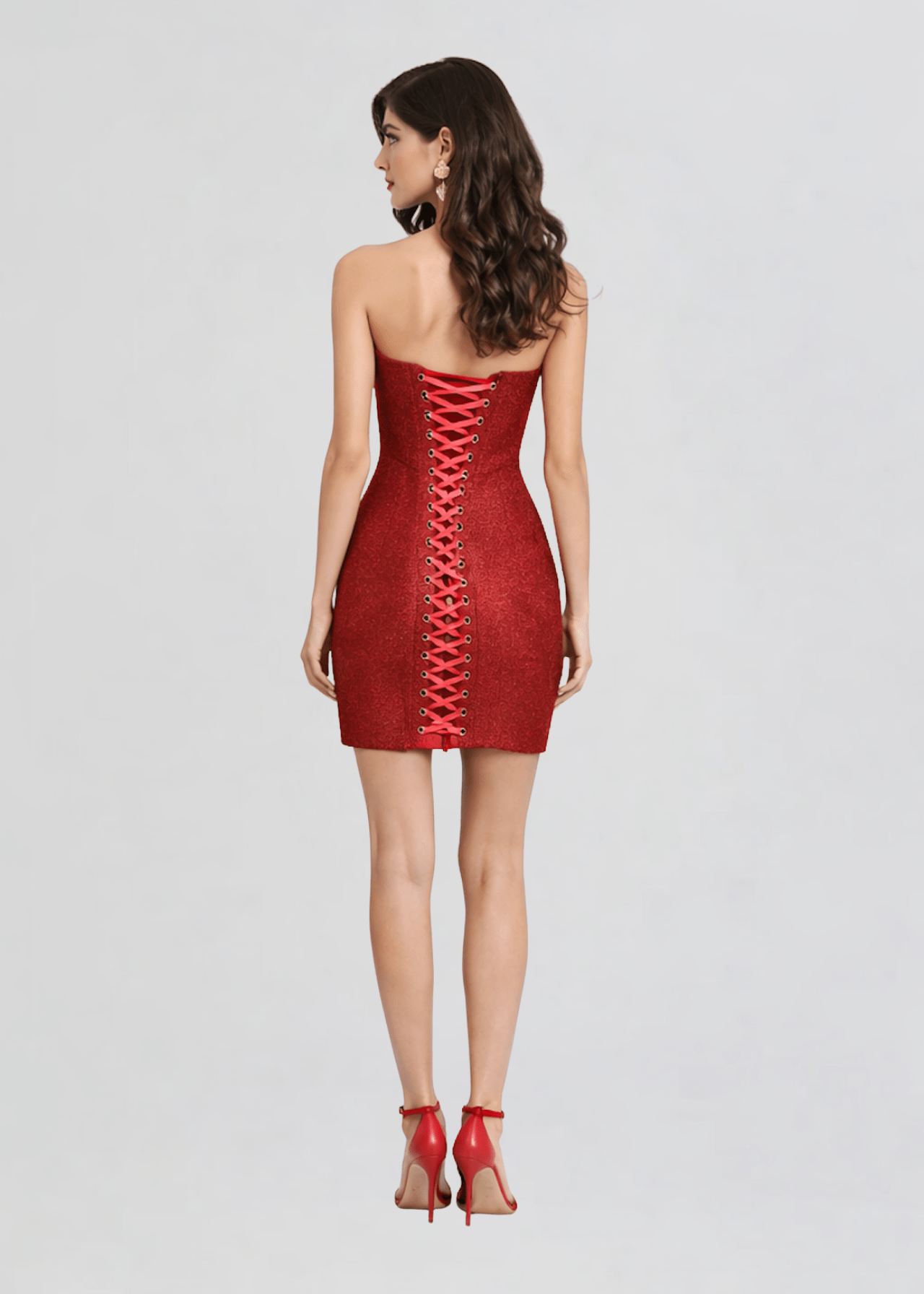 The stunning Elise Corset Mini Dress will turn heads because it is made to be captivating from all sides. This dress has a structured corset bodice with boning inserts for a perfect, sculpted fit. It is made of shimmering fabric that shimmers with every movement. The subtle side zipper guarantees seamless wear, and the lace-up back adds a touch of elegance and versatility. This dress is the perfect fusion of refinement and glitz thanks to its figure-hugging design and strapless neckline.