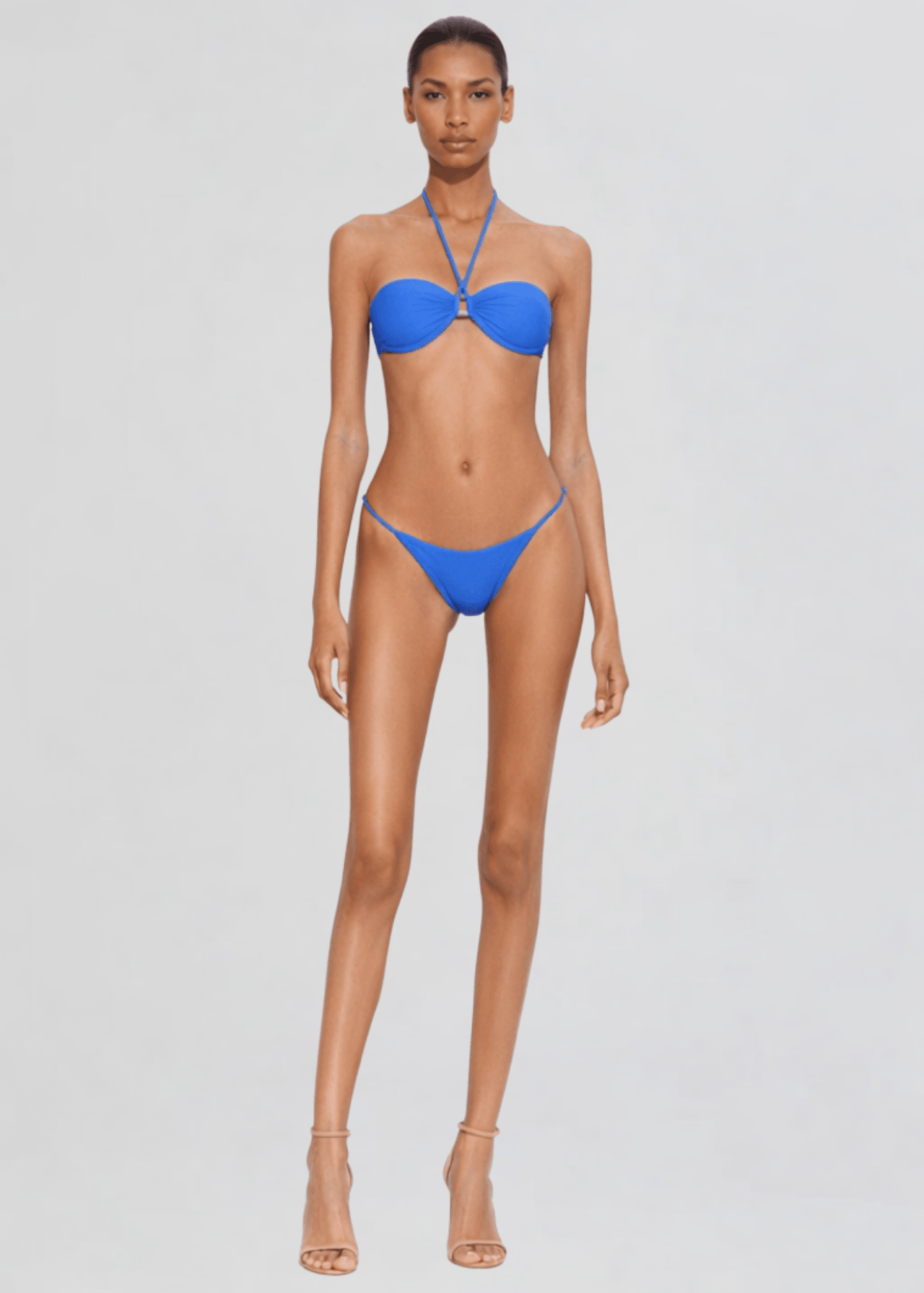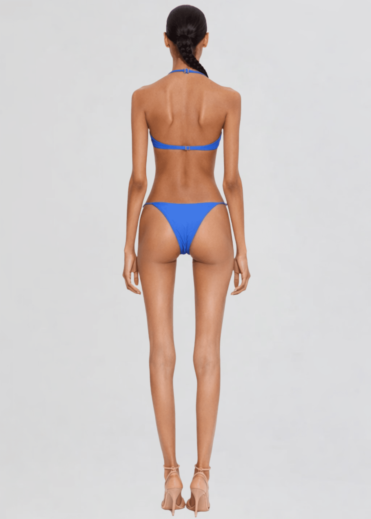 Turn heads this season with our ultra-sleek Elsie Bikini Set in a bold electric blue. Designed for the modern beach muse, this two-piece features a structured bandeau-style top with gathered detailing and a cross-front halter strap that clips elegantly behind the neck. The matching high-cut bottoms elongate the legs and offer a flattering, cheeky fit.