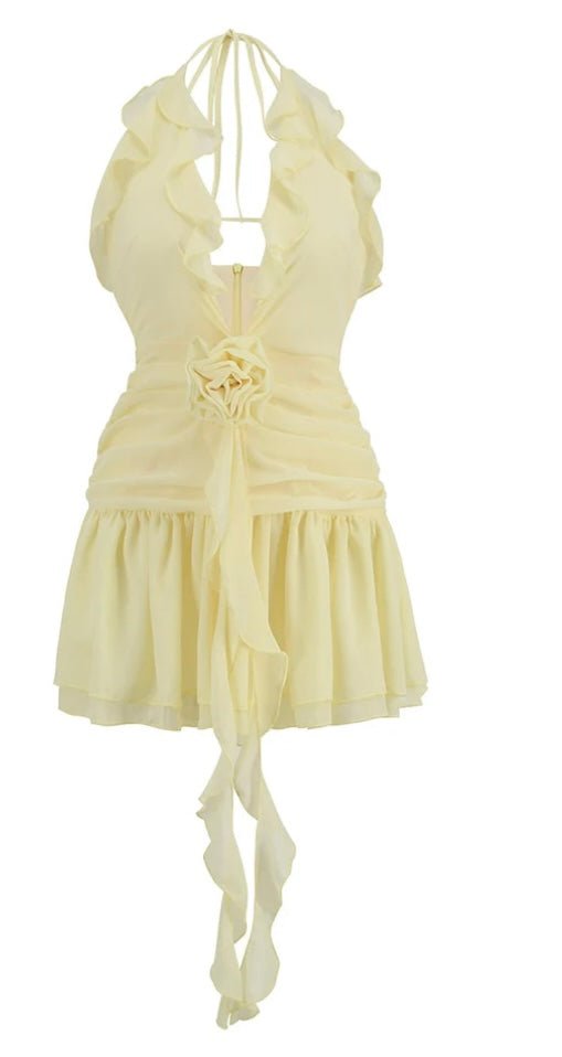 Sexy and feminine this beautiful mini dress is form fitting with shirring body shaping detail. The plunge neckline and ruffle mini skirt complement the silhouette. Perfect for day to date! The style is in buttercup the must have color of the season.