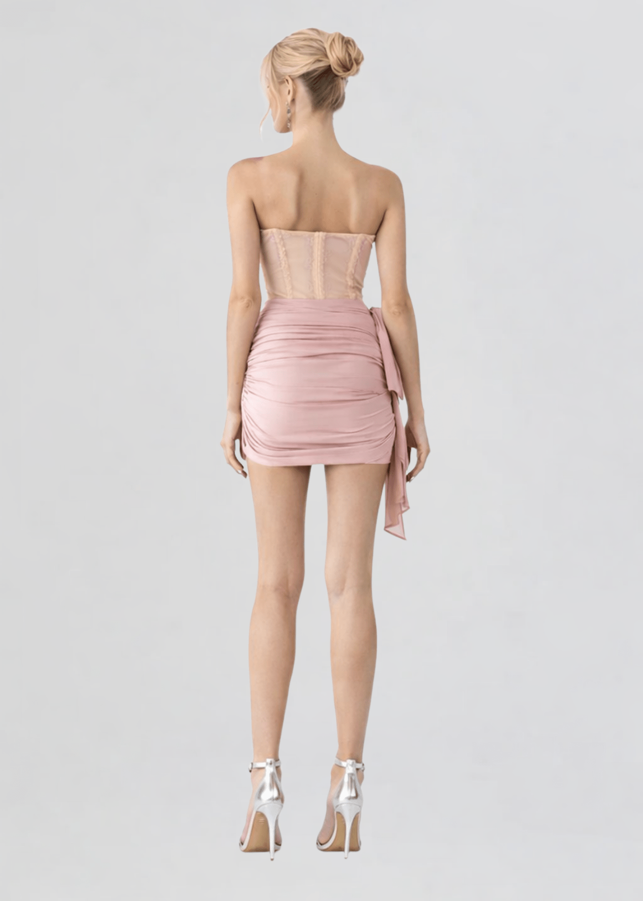 Explore our exquisitely designed Minka Dress, which skillfully combines delicacy and beauty. While lace trimming on the upper body gives classic elegance, the chest cup perfectly combines delicate lace and skin-tone fabric for security and appeal. The waist's pressure design adds dimension, and the soft knit fabric underneath guarantees comfort and style.
