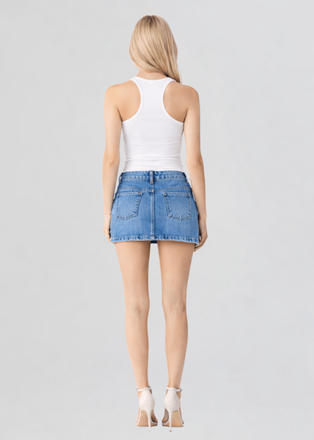 The perfect denim mini skirt is here! This denim mini skirt features belted details and is low rise fit.