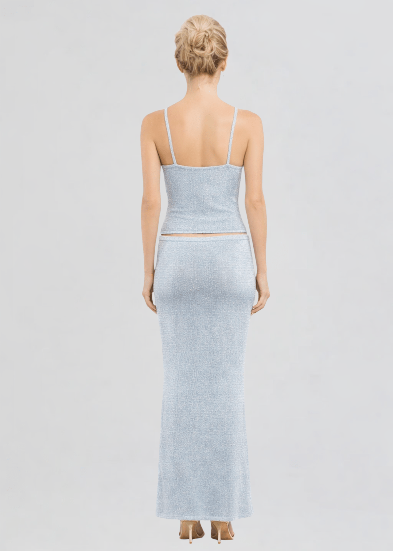 The Carolina Camisole in Baby Blue Sequin by ASTA RESORT. A scintillating thin-strap camisole with a V neckline, knitted from a our signature cotton-based yarn with micro-sequins throughout.