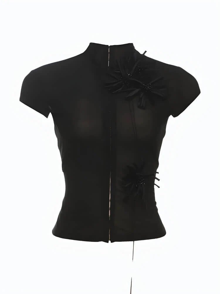 The Puss Sheer Top captures modern sensuality through structure and detail. Crafted in sheer black fabric, it features a sculpted silhouette with a high neckline and bold floral appliqués that add a touch of avant-garde romance. Effortlessly balancing elegance and edge, it’s a statement piece designed to be styled with leather, denim, or tailoring — the kind of top that turns simplicity into allure.