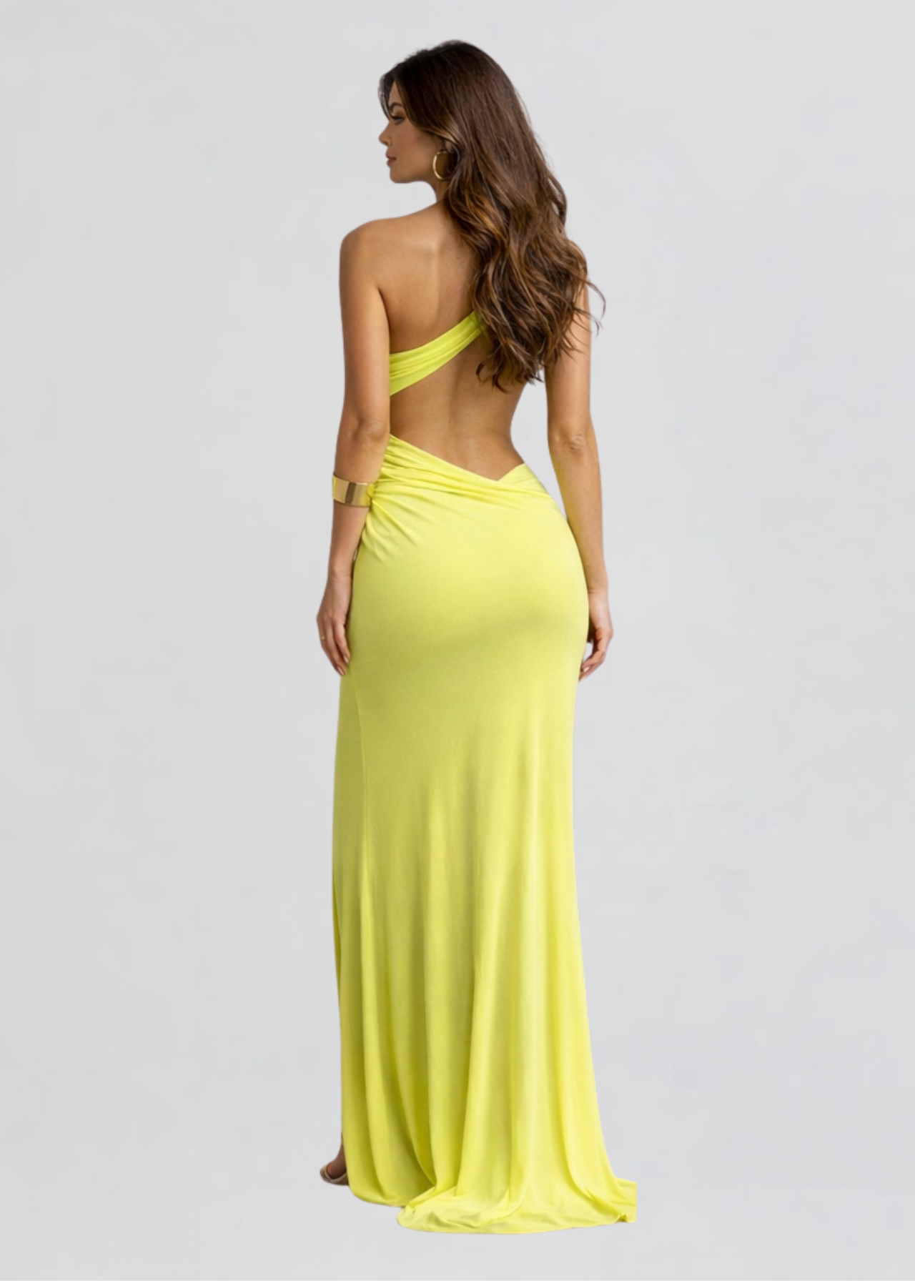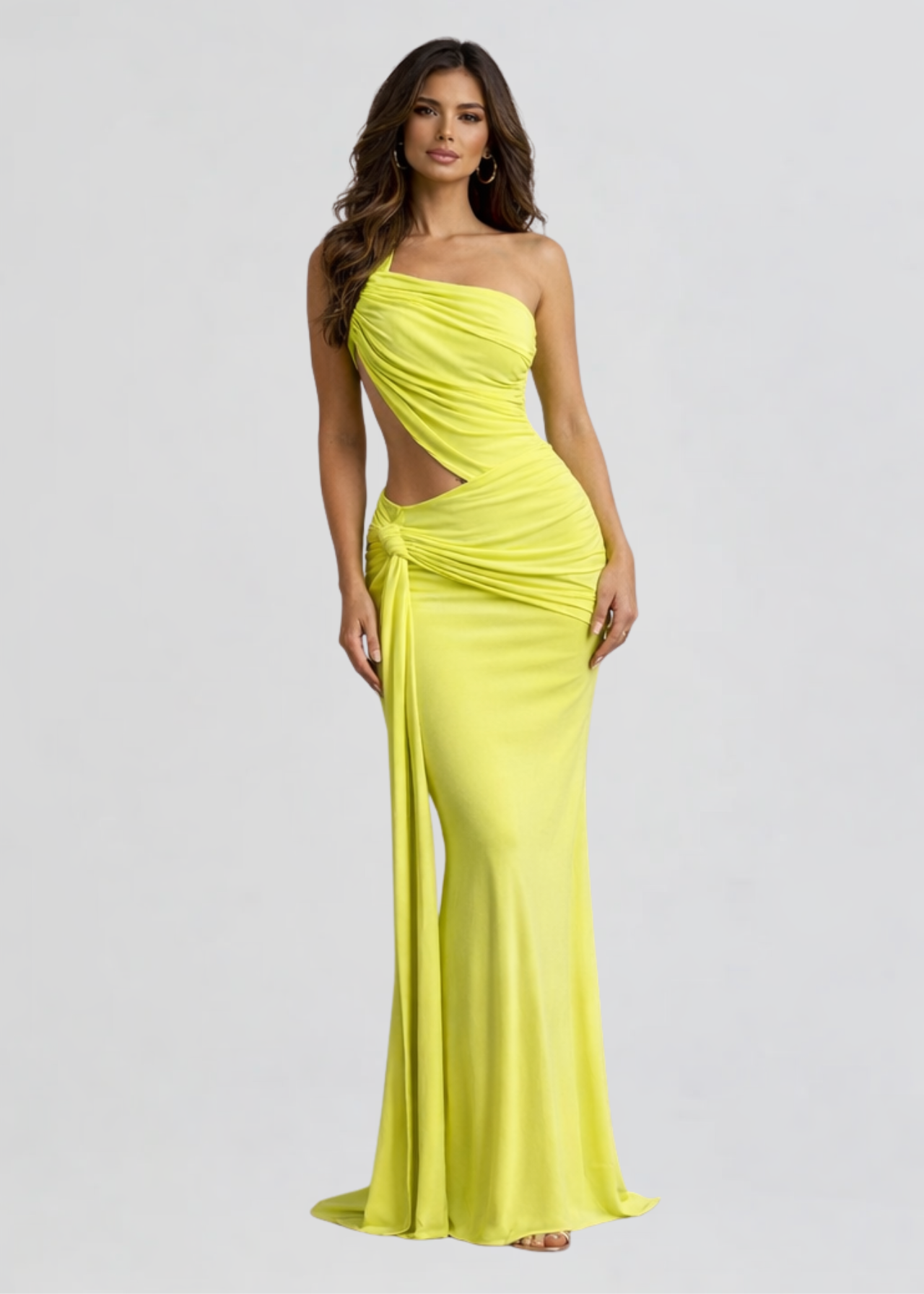 Make a bold statement in this striking one-shoulder maxi dress designed to highlight your silhouette. Crafted from a smooth, figure-skimming fabric, this vibrant lime gown features elegant draping and a modern asymmetrical design. The waist cut-out and gathered hip detail create a flattering hourglass effect, while the floor-length skirt adds effortless sophistication.